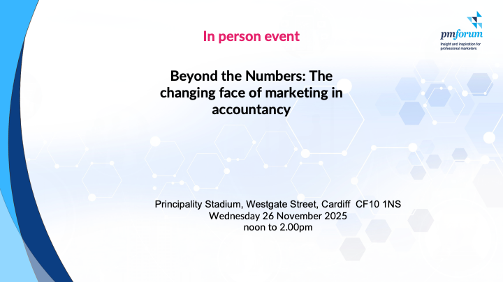 This informal session will bring together marketing and business development leaders from accountancy practices to share perspectives on how the profession is evolving. It is suitable for frmwide leaders and frontline advisors with responsibility for marketing and BD as well as dedicated marketing and BD professionals.
