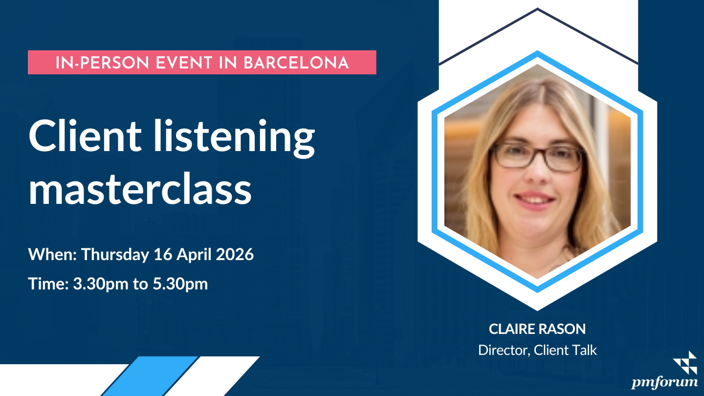 Initially, Claire will share the findings of PM Forum’s 14th Annual International Marketing Benchmark. She will then lead a masterclass on launching and/or enhancing a client listening programme. Her approach is informed by coaching and the psychology of how everyone listens.